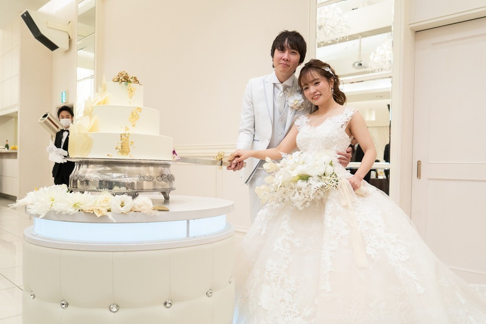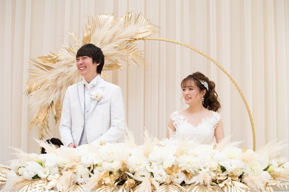 披露宴では、そのテーマカラーを「ホワイト×ゴールド」にして、さまざまな当日の準備を進められたおふたり。
