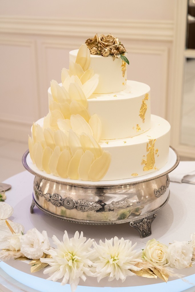 ウエディングケーキもテーマカラーに合わせて、金色の花や金箔を飾ったものに。