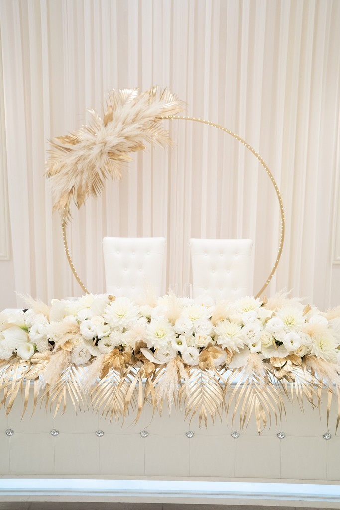 また高砂を華やかに彩るサークルアーチのメインバック装飾も施され、パーティー会場の中で存在感を発揮しました。