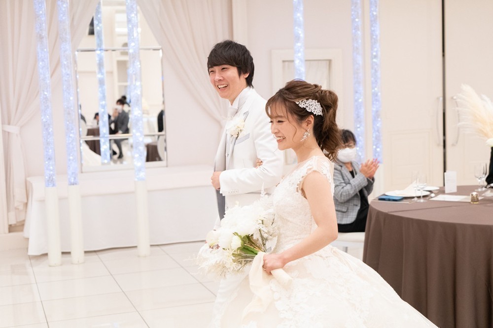 再入場では、カラードレスとタキシードをお召しになったおふたりが各テーブルを回りながら、ゲストの皆様と写真撮影を楽しまれました。