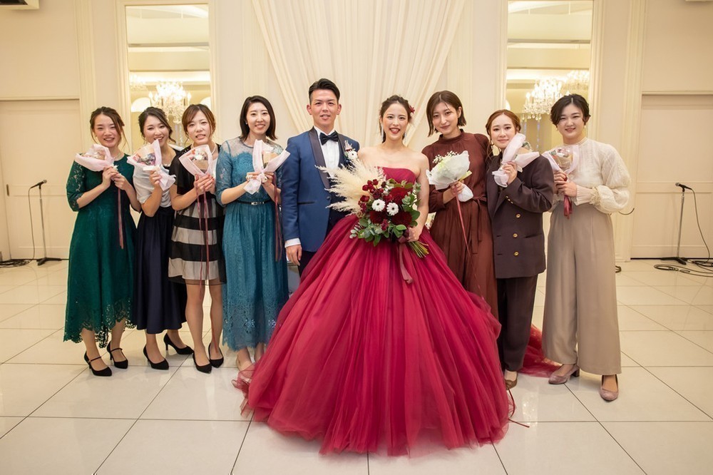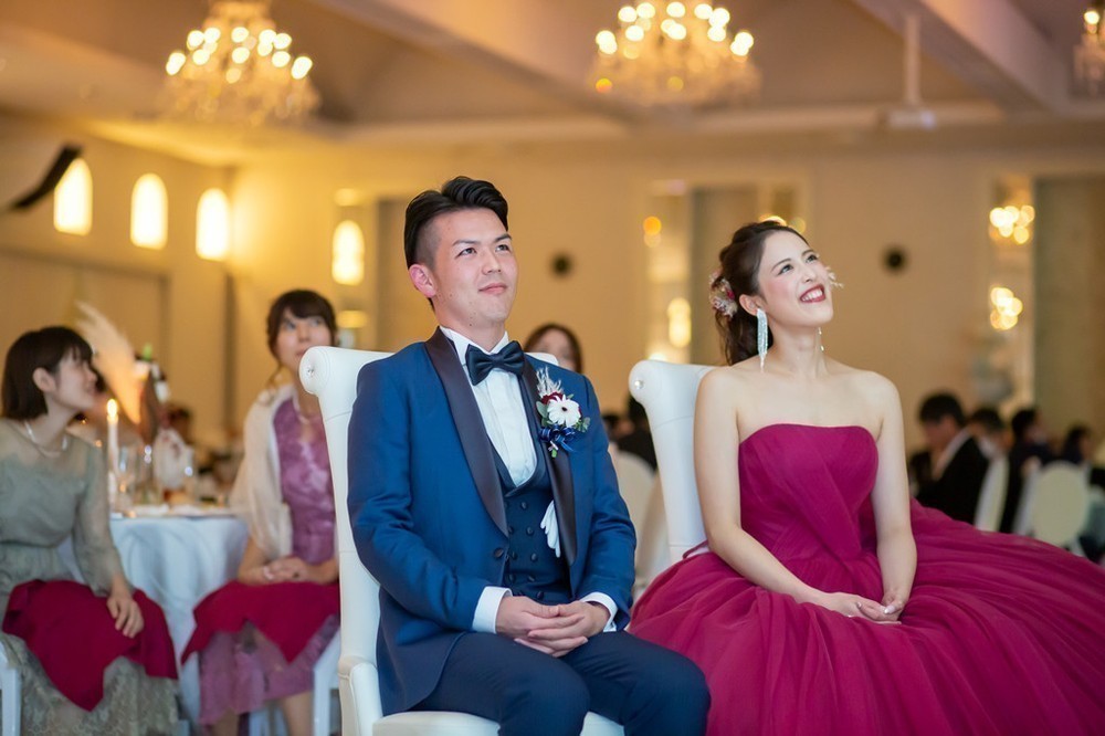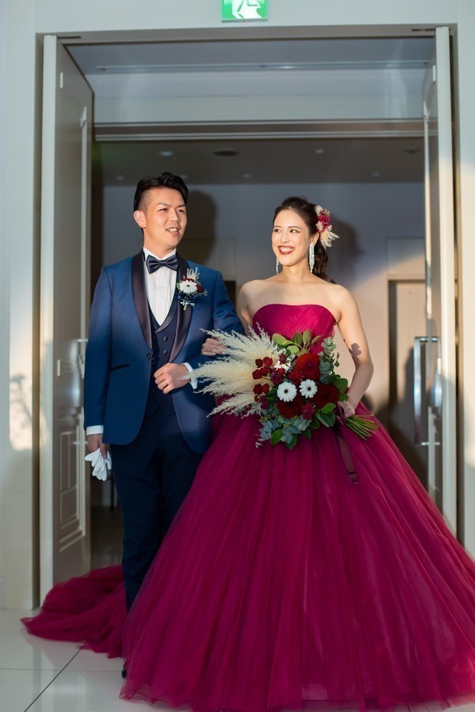 おふたりの再入場は、ワインレッドのドレスとネイビーのタキシードをお召しになりました。会場装花との相性バッチリの、大人っぽい装いです。