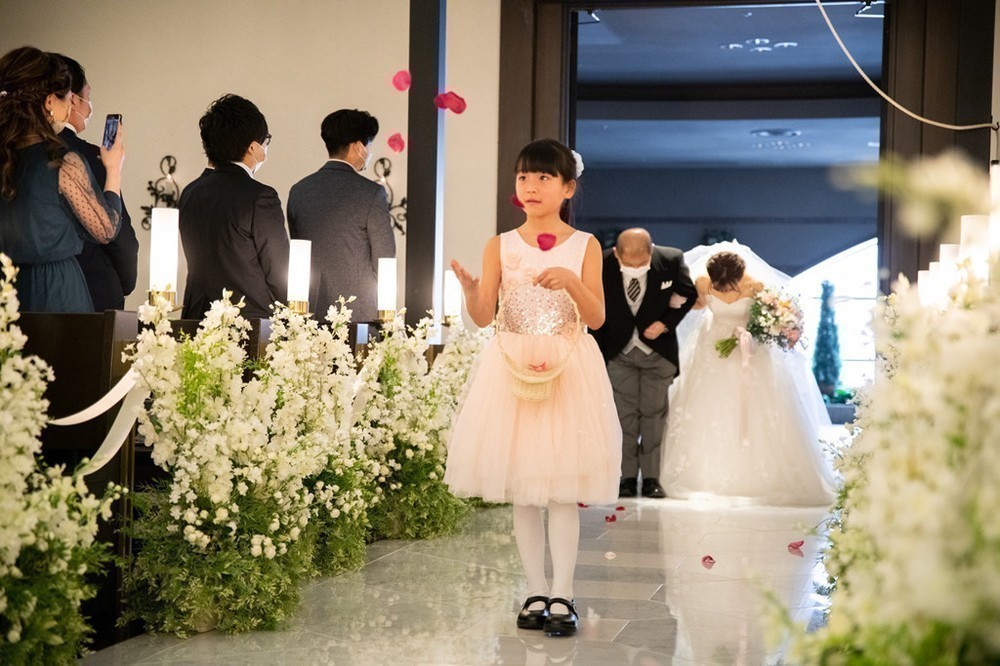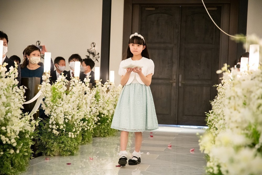 挙式でのフラワーガールやトレーンベアラー、リングガールを務めたのは元教え子の皆様、というユニークな演出でした。