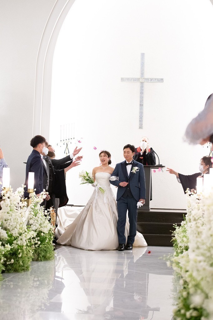 無事に挙式をおえ、退場なさるおふたりの表情は