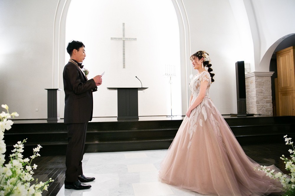 チャペルで新郎から新婦へ、お手紙の朗読と花束が贈られました。