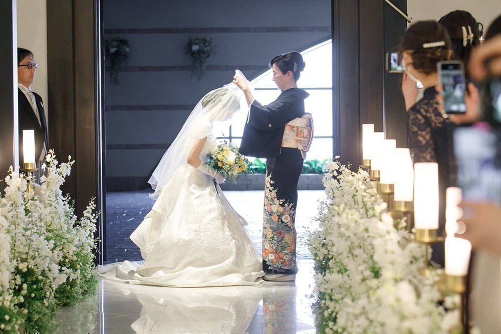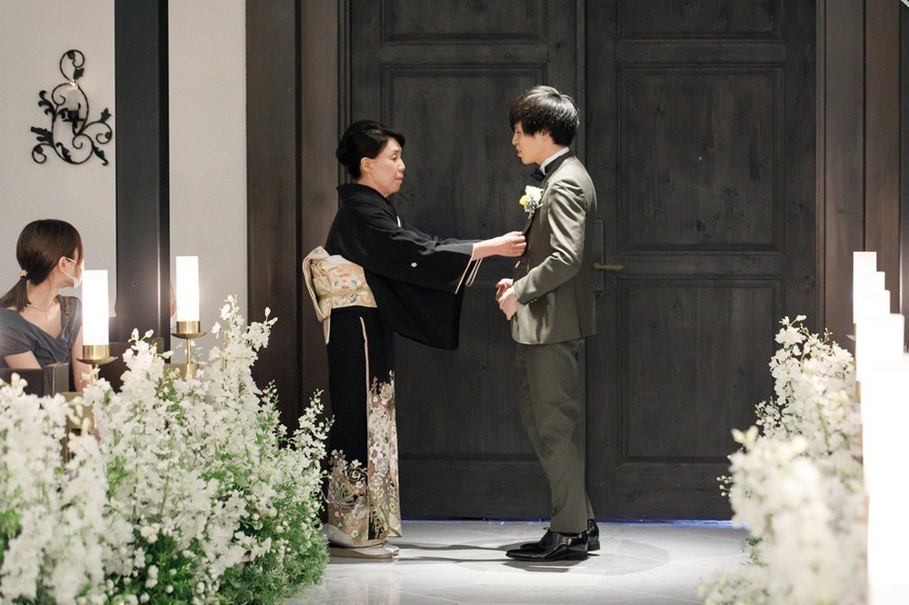 やな様がチャペルにご入場なさる際には、お母様からジャケットセレモニーが行われました。