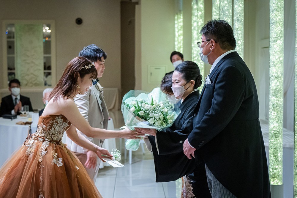 披露宴の結びにはM様から親御様へ感謝のお手紙が読まれ、続いてご両家の親御様へ、花束が贈られました。