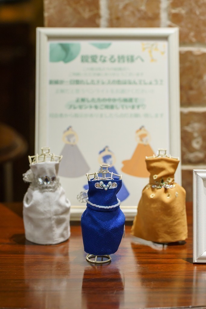 受付時には、M様のカラードレス色当てクイズとして、ゲストの皆様が予想した色のサイリウムをピックアップしていただきました。