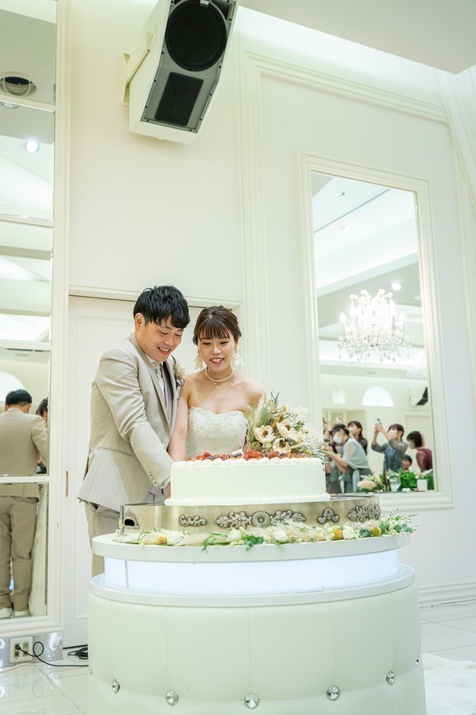 M様のご友人おふたりからのスピーチをいただいたあと、おふたりのケーキカットとファーストバイトが行われました。