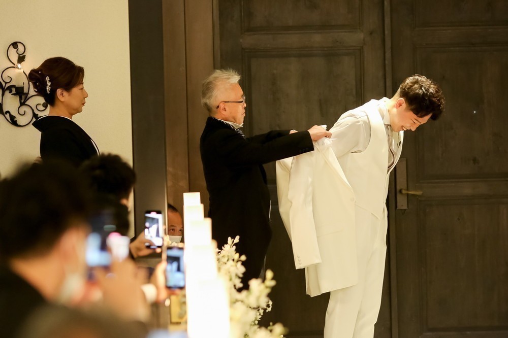 お父様によるジャケットセレモニーと、お母様からのブートニアの演出を経て、