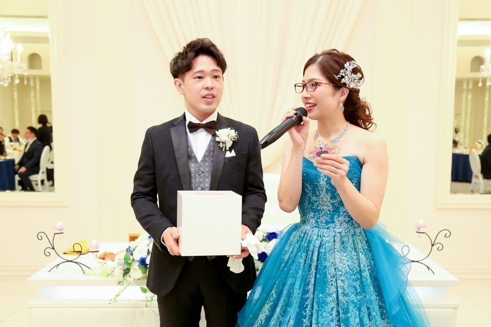 結びには、りほ様から親御様へ感謝のお手紙が朗読され、おふたりから親御様へ記念品が贈られました。全体が感動で包まれた瞬間でした。