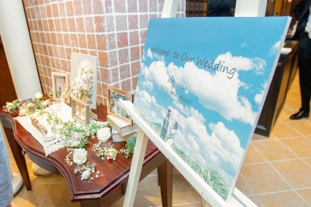 当日、ウェルカムグッズと一緒に生花をウェルカムスペースに飾り、