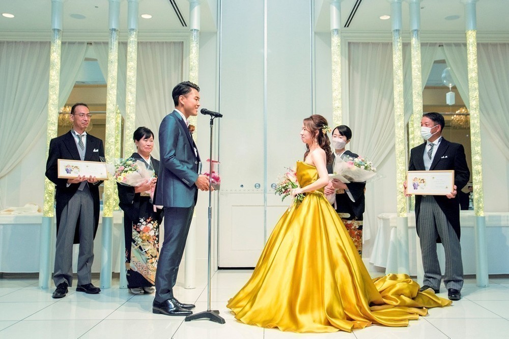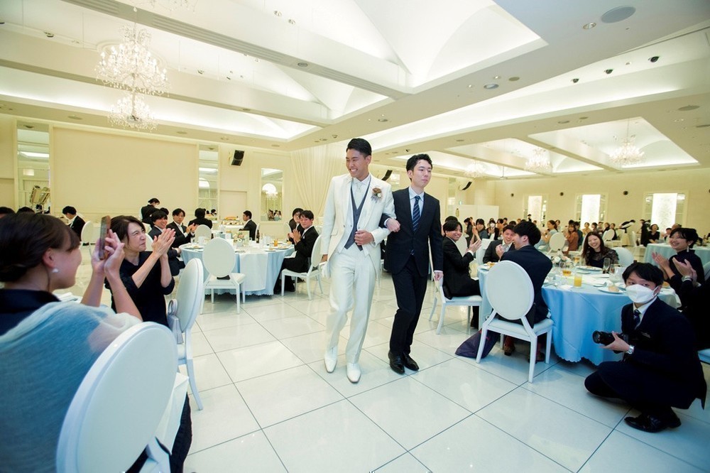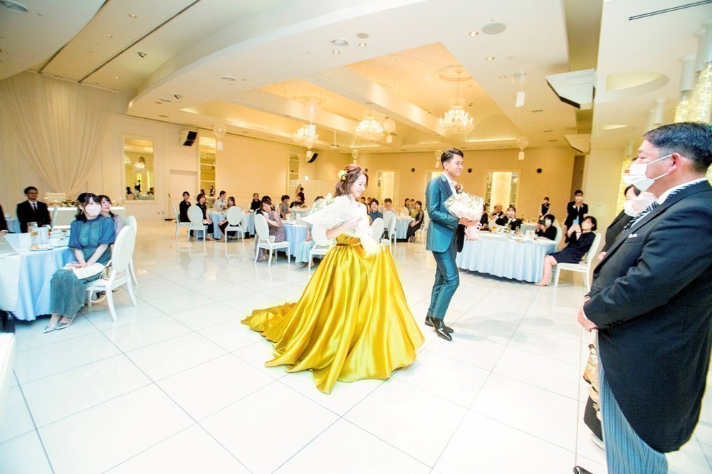 再入場では、カラードレスとタキシードをお召しになったおふたりが、