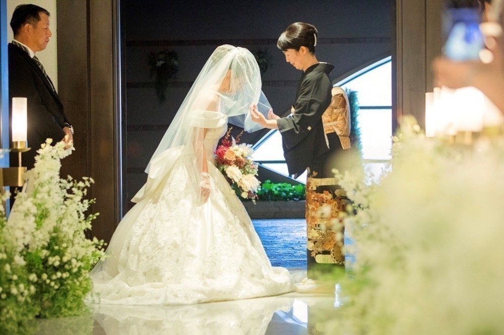 S 様がチャペルにご入場なさる際には、お母様からのベールダウンがあり、