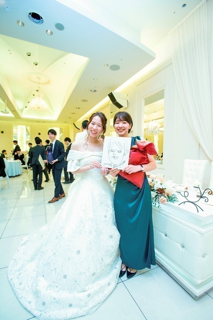 会場一体が盛り上がり、その後おふたりそれぞれがこれぞという似顔絵を書き上げたゲストへプレゼントが贈られました。