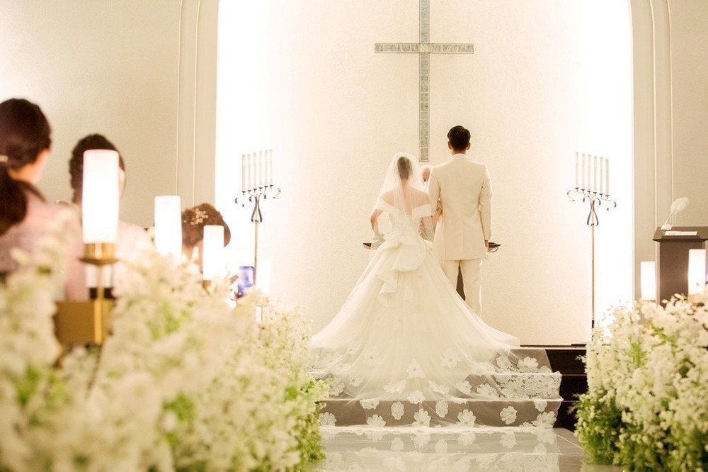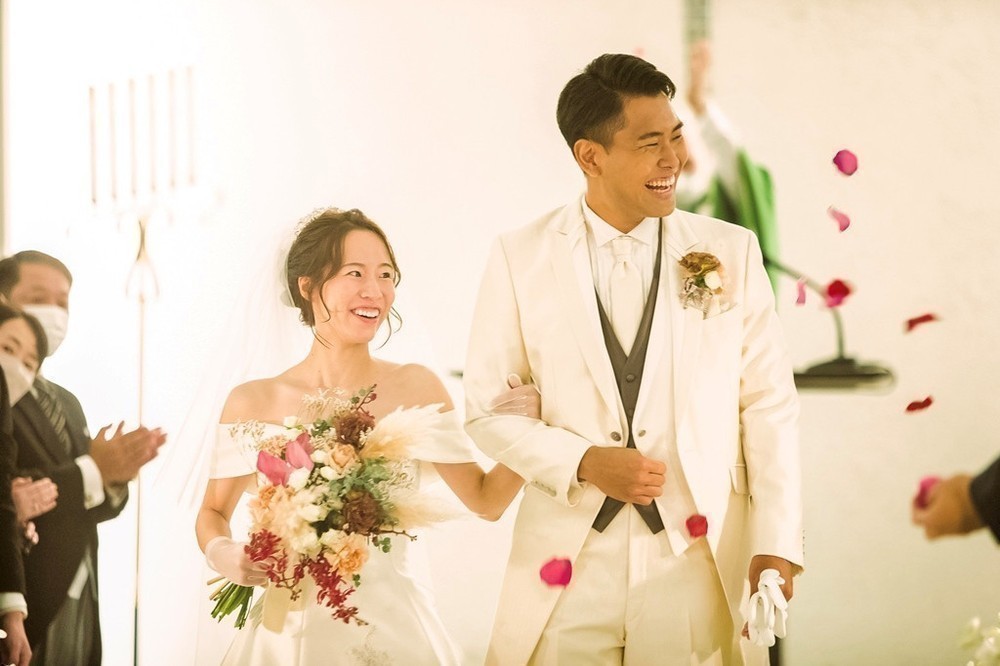 祭壇に映えるトレーンは神秘的な雰囲気を加え、K 様と S 様は退場時にはとびっきりの笑顔で、ゲストの皆様からの祝福を浴びながらチャペルを後になさいました。