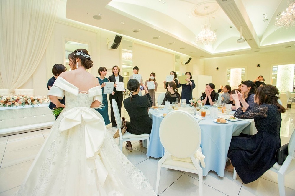 ゲスト全員参加型の余興で、テーブル内でおふたりのパーツ毎に、1名ずつ回して書いていくスタイルです。