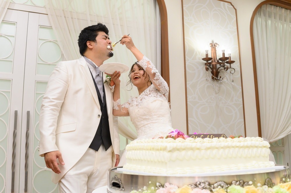 おふたりのケーキカットとファーストバイト後には、レイ様からお子様へバイト♡お子様は嬉しそうにお口を大きく開けてイチゴをぱくり!