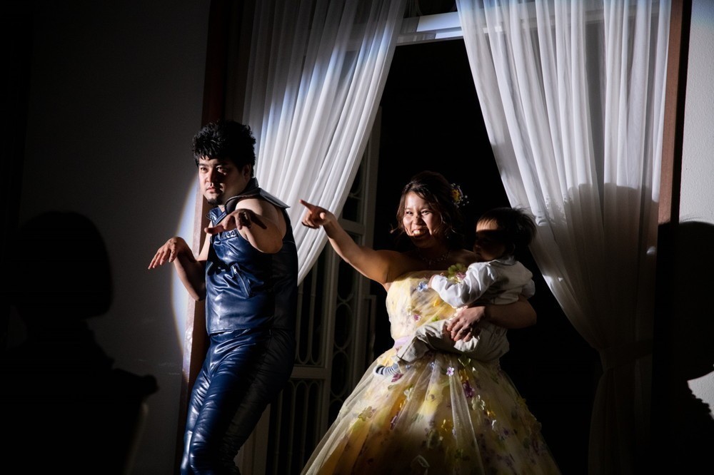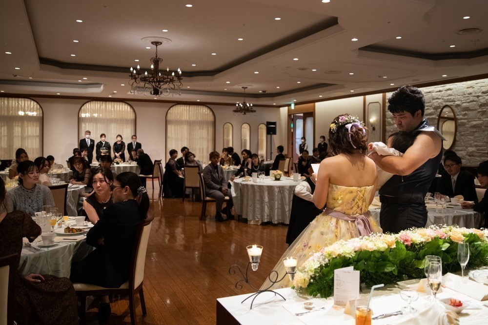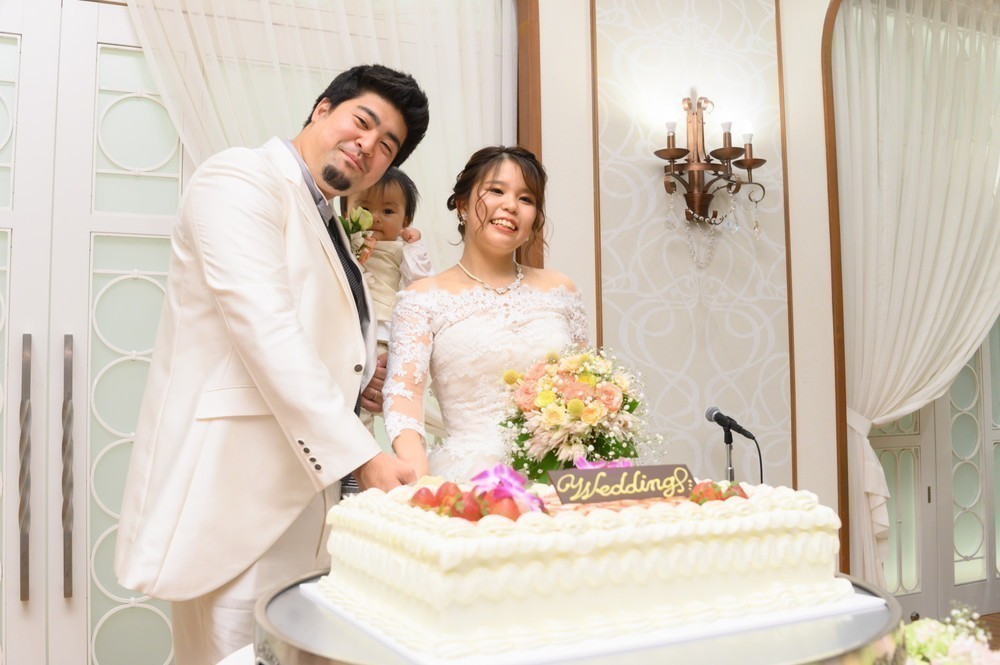 披露宴は、ケンシロウ様とレイ様、そしてお子様と3人でのご入場です。