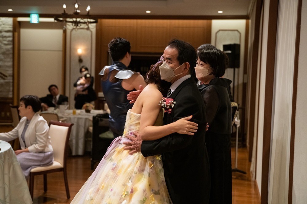 披露宴の結びには、レイ様から親御様へ感謝のお手紙が読まれた後、おふたりからご両親様へ記念品を贈呈され、レイ様とお父様とのあたたかいハグで感動に包まれた瞬間でした。