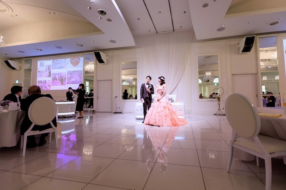 再入場では、お色直しをされたおふたりが各テーブルを回りながら写真撮影を