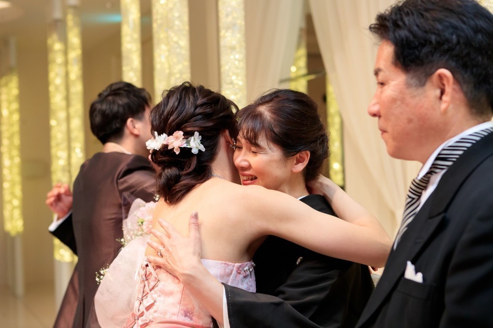 続いて、ご両家の親御様に記念品が贈呈され、M 様とお母様との熱いハグには
