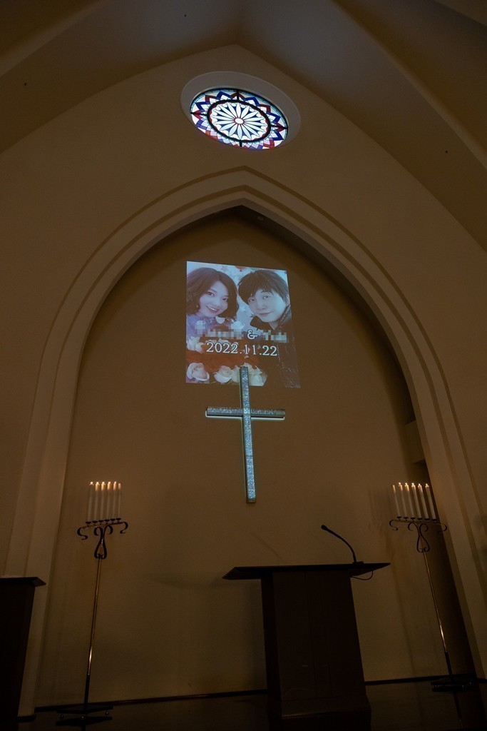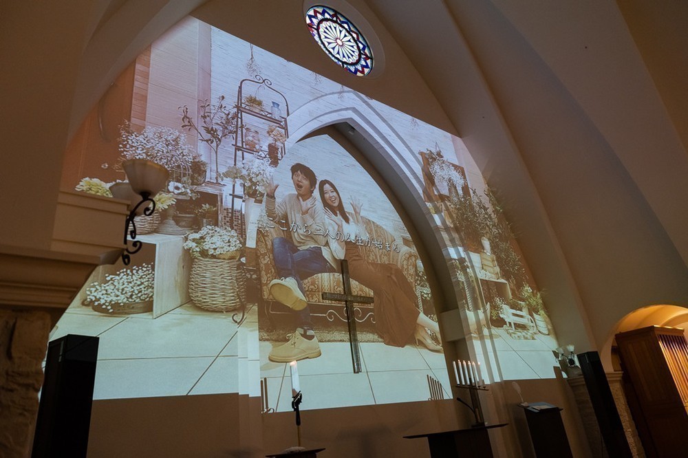 おふたりからのメッセージが流れだし、早くもチャペル内は感動に包まれた様子。