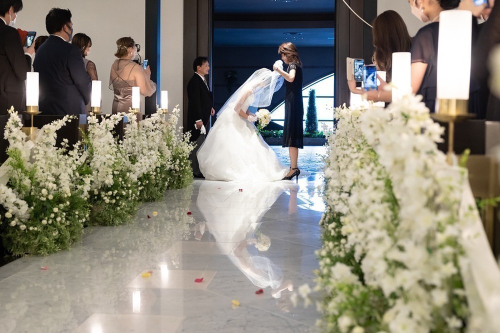 りんちゃん様はチャペル内でお母様からのベールダウンをしていただき、