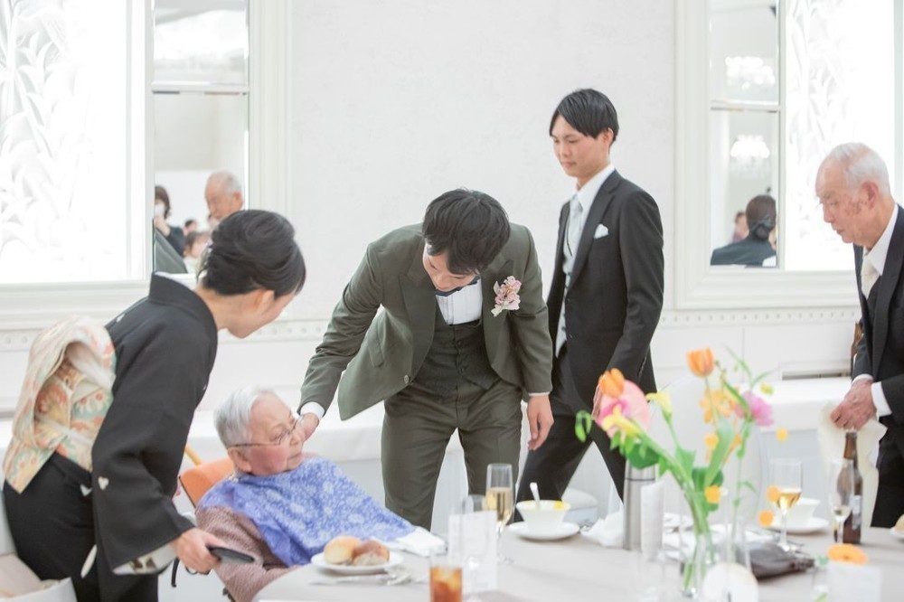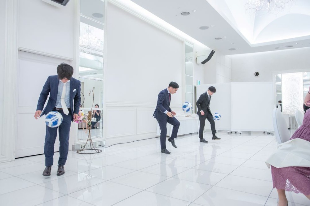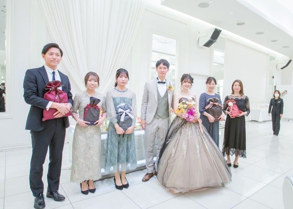 新郎ゲストテーブルから代表者に出てきてもらい一番長く続いた方にプレゼントをお渡しになられました。