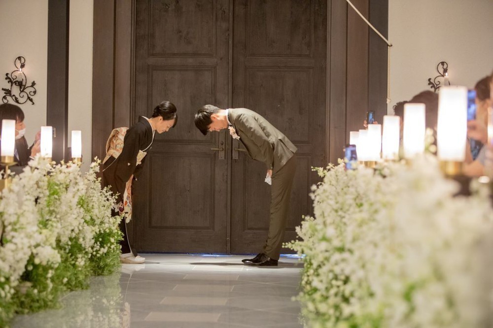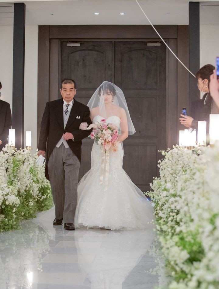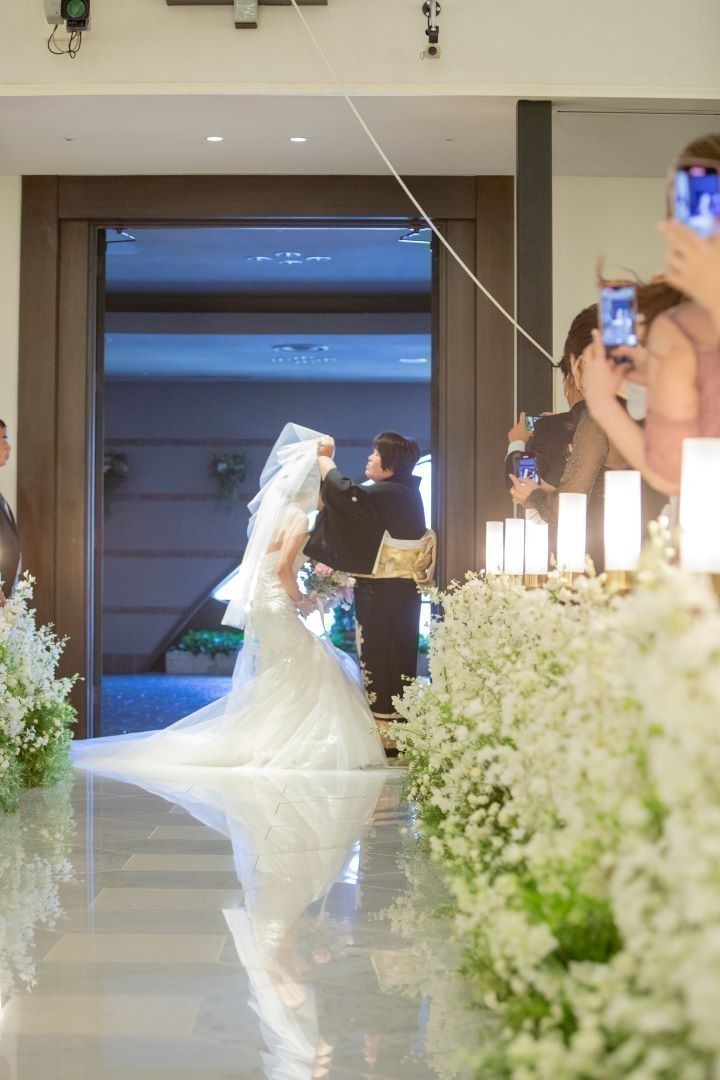 入場の際はお母様からベールダウンをしていただき、バージンロードはお父様と歩まれました。