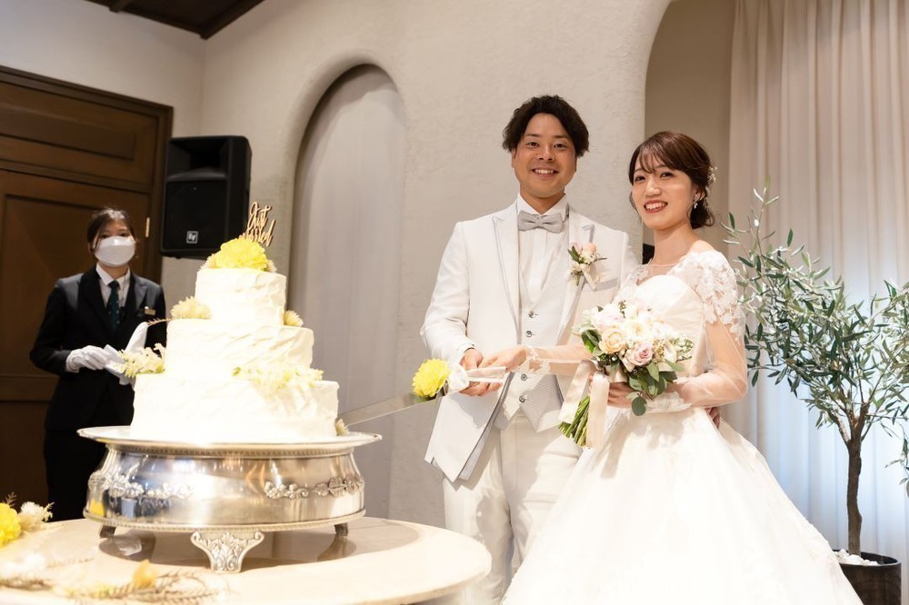 オリジナルのウェディングケーキに入刀された後はファーストバイトです。
