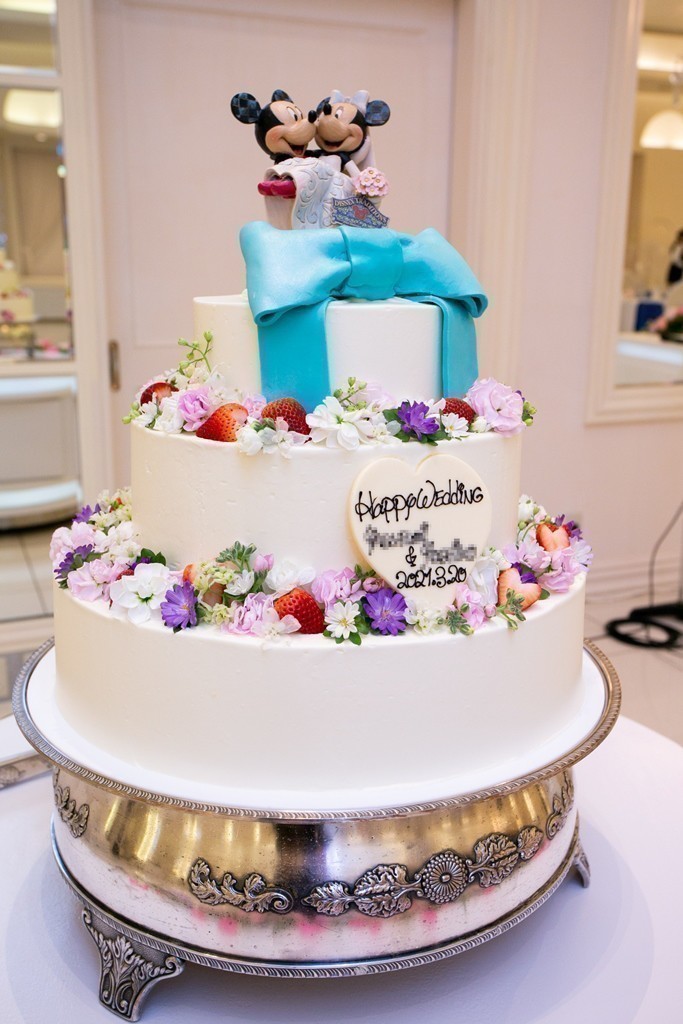 ウエディングケーキにはおふたりが手配なさった、ウエディングドレスとタキシードを着たミッキー&ミニーのトッパーがあしらわれ、ゲストの皆様から「カワイイ!」「すごい!」の声が上がっていました。
