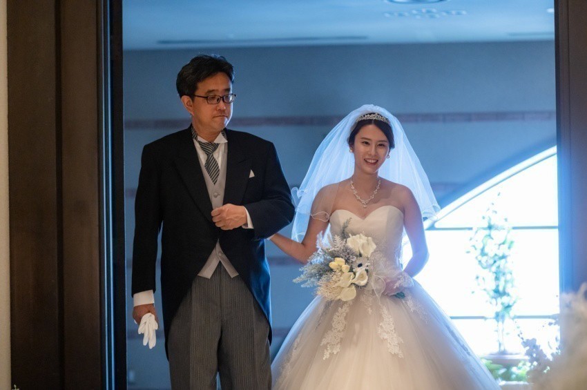 お父様にエスコートされたH様がバージンロードを歩みます。