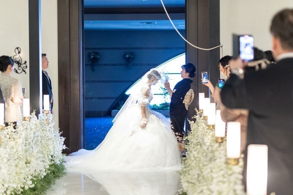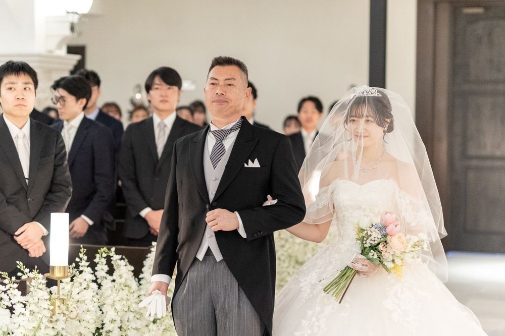 お父様よりグローブを受け取りバージンロードを歩まれました。
