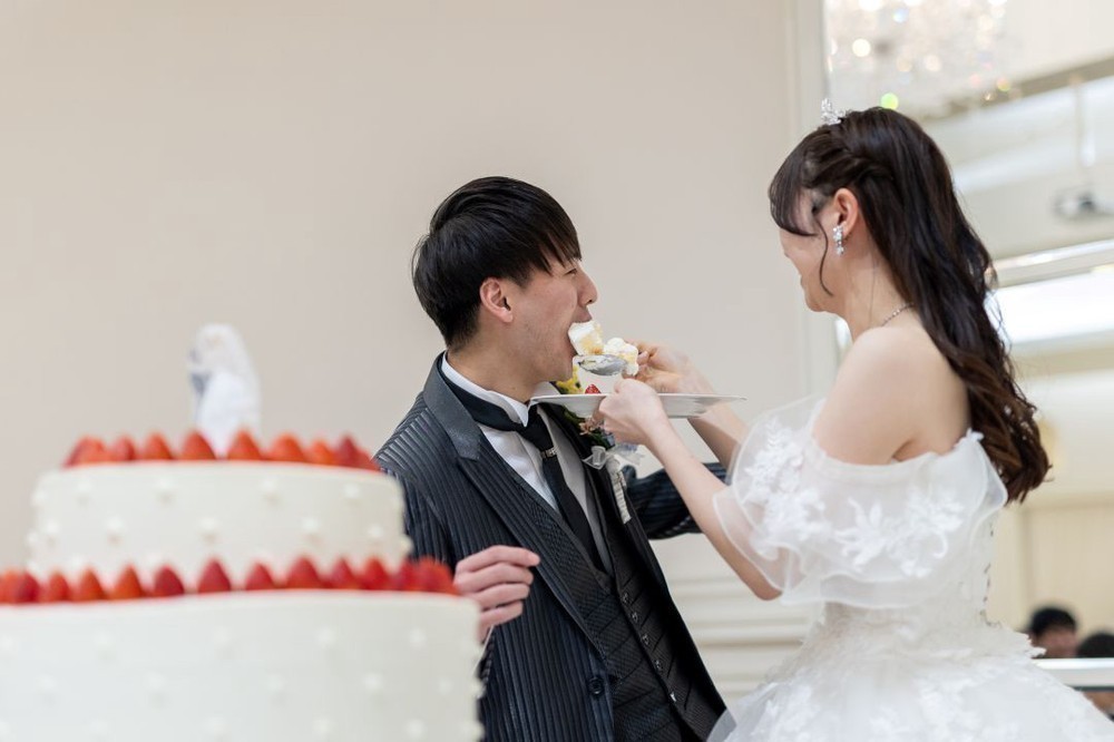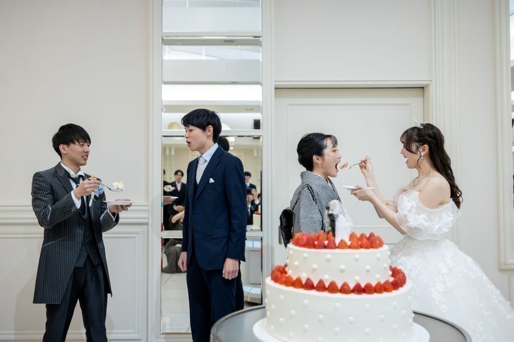 ゲストが見守る中、ゆっくりとケーキに入刀し、入刀後はファーストバイトを。
