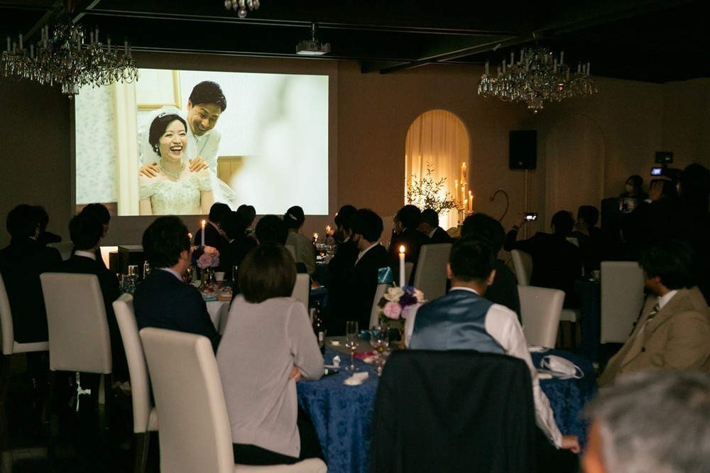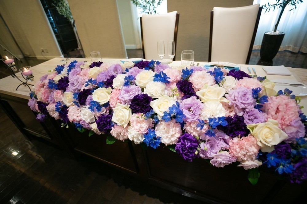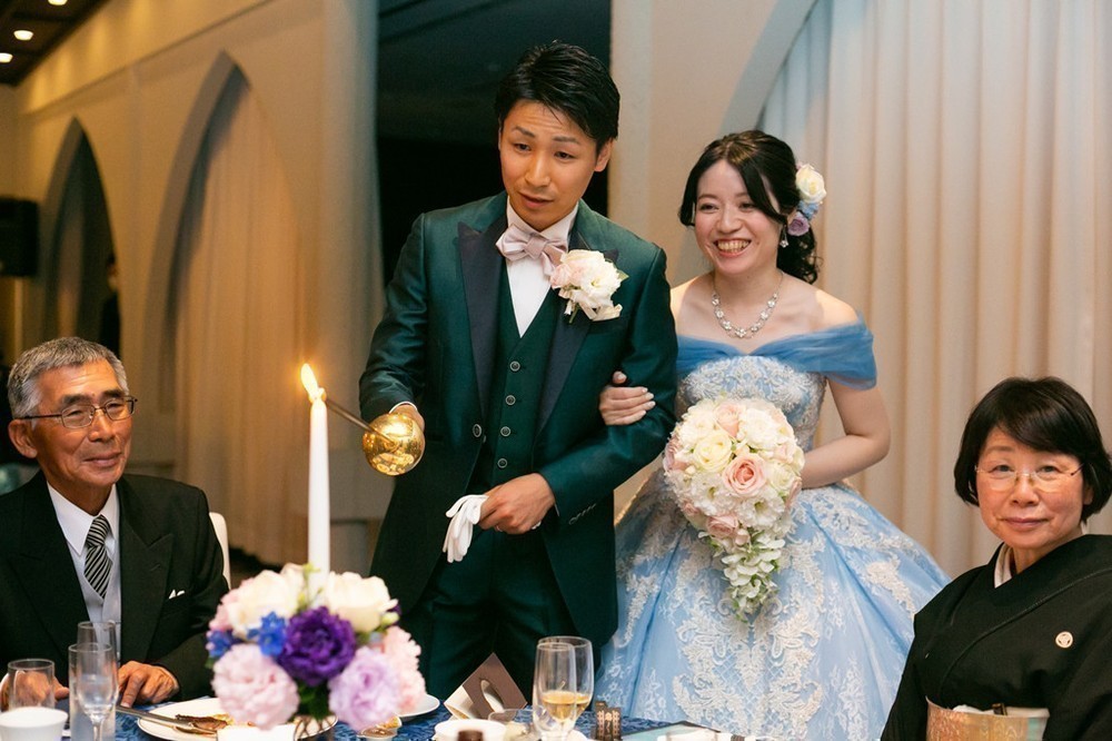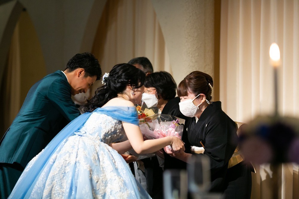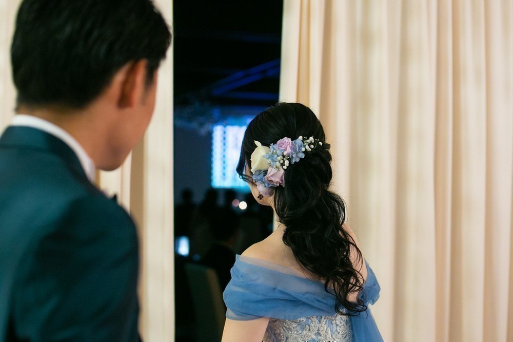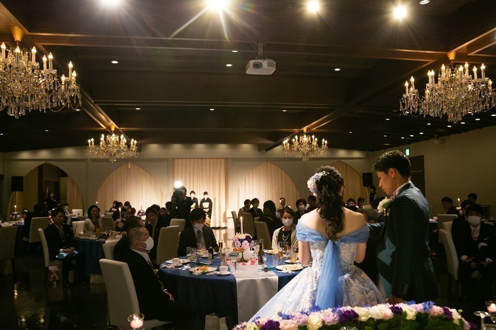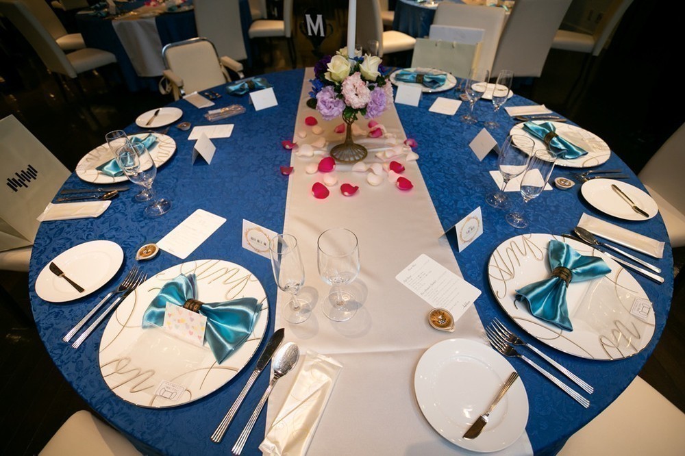 続く披露宴では、会場をブルー系でコーディネートなさったおふたり。