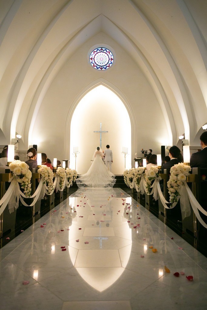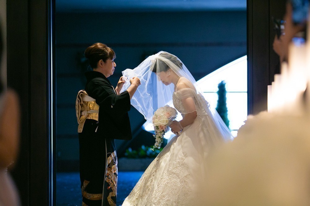 ちょこ様はチャペル内で、お母様にベールダウンをしていただいた後、祭壇の前に進まれました。