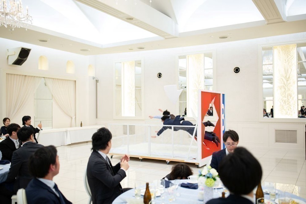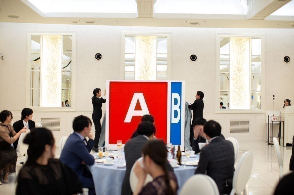 回答が多いアルファベットの壁に新郎と新郎が指名した友人の2人でダイブして正解発表されました。