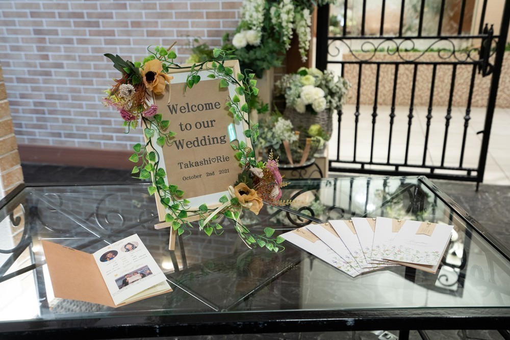 披露宴では、ウエルカムボードや席次表、席札などを手作りして、感謝のお気持ちを表現なさった隆様と梨江様。