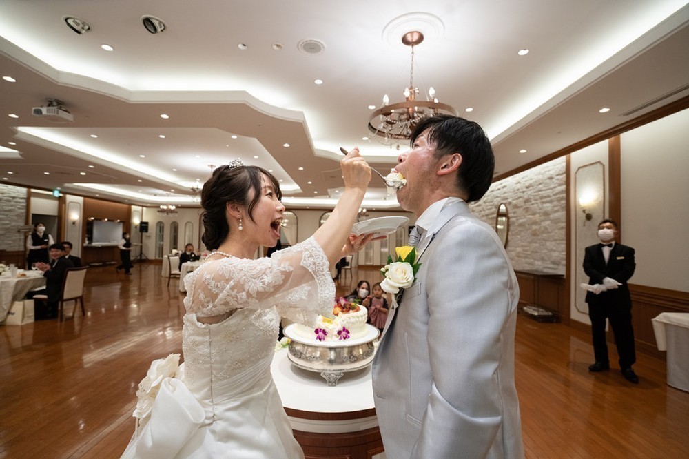 パーティーが始まりウエディングケーキのカットが催されると、続いてファーストバイトが行われました。