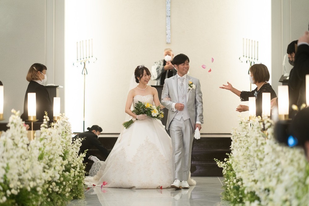 退場時には、ご親族による祝福のフラワーシャワーを浴び、とても幸せそうな笑顔を見せてくださったおふたり。