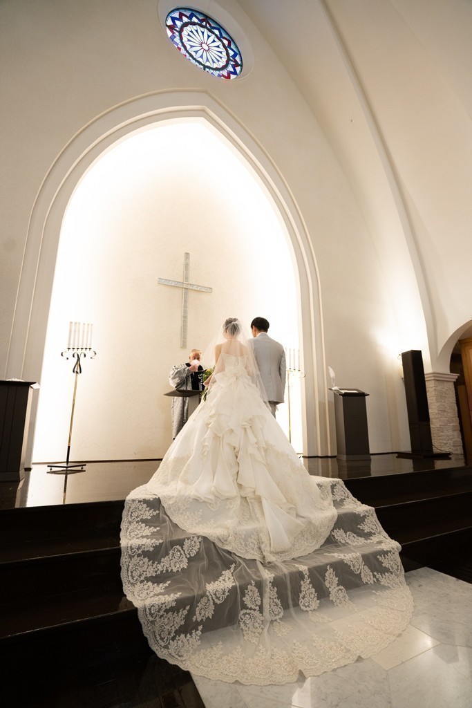 祭壇に映えるトレーンが美しく、ゲストの皆様も思わず見とれてしまうほど。チャペルが、とても幻想的な空間になりました。