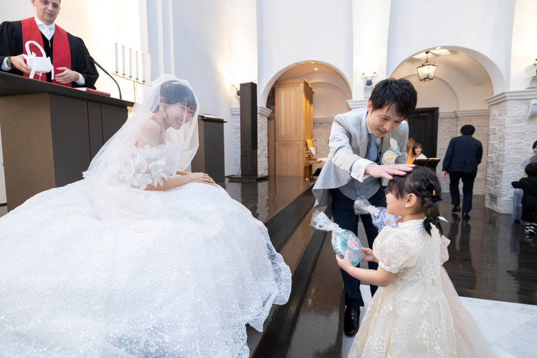 3人で仲良く指輪をおふたりに届けていただき、チャペル内が和やかな雰囲気に包まれました。