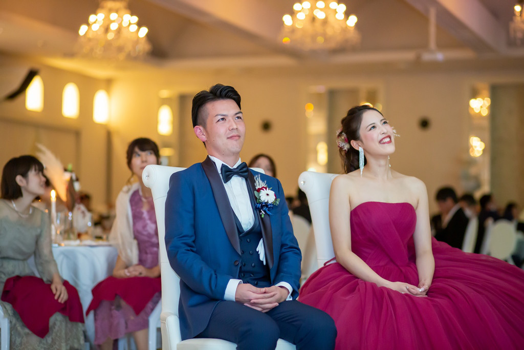 おふたりの再入場は、ワインレッドのドレスとネイビーのタキシードをお召しになりました。会場装花との相性バッチリの、大人っぽい装いです。