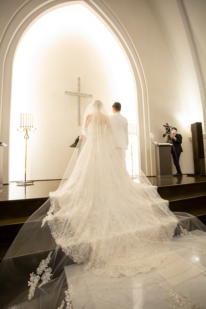 祭壇に映えるトレーンが美しく、ゲストの皆様の視線はY様に釘づけです。