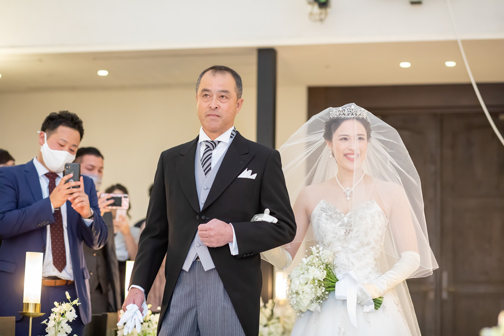 Y様のご入場は、ベールダウンはお母様に、エスコートをお父様にしていただきました。