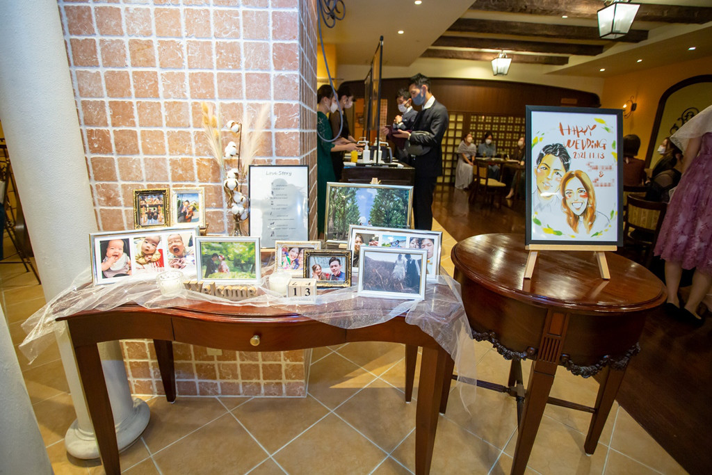 ウェルカムスペースには、おふたりの似顔絵や写真のほかに、カラードレスの色当てクイズが設置されました。