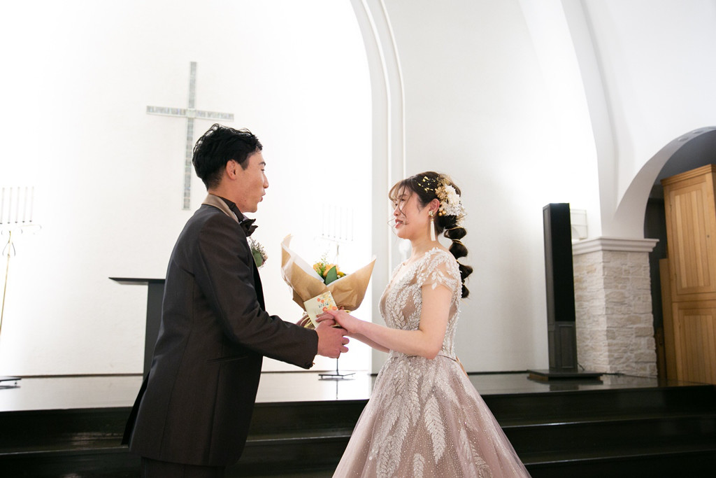 チャペルで新郎から新婦へ、お手紙の朗読と花束が贈られました。