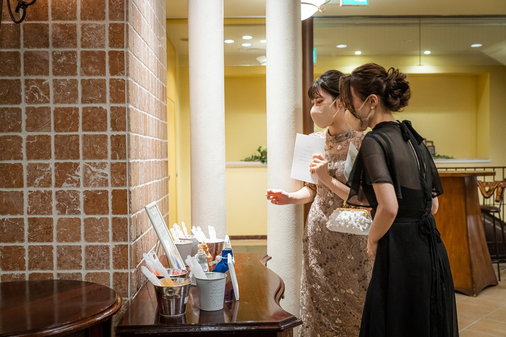 受付時には、M様のカラードレス色当てクイズとして、ゲストの皆様が予想した色のサイリウムをピックアップしていただきました。