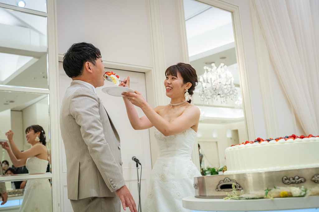 M様のご友人おふたりからのスピーチをいただいたあと、おふたりのケーキカットとファーストバイトが行われました。
