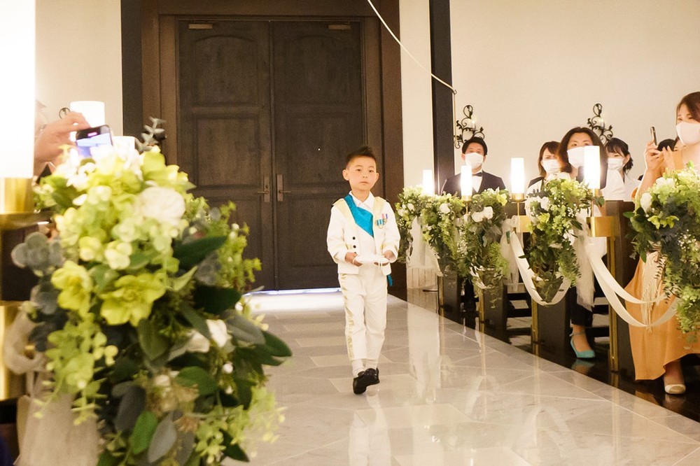指輪交換の前には、リングボーイが登場。かわいらしい演出に、緊張感に包まれていたチャペル内が笑顔になりました。